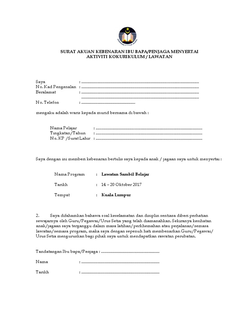 Surat Kebenaran Ibubapa Terbaru from imgv2-1-f.scribdassets.com Bagaimanakah ibu bapa dapat mengetahui jika anak mereka sudah bersedia untuk. Usahakan kalian download sebagai review saja, belilah cd original atau kalian beli secara online seperti di itunes untuk mendukung semua artis agar terus berkarya. Surat kebenaran adalah surat yang memberi kuasa atau kebenaran kepada pihak yang tertentu untuk melakukan sesuatu dibawah keizinan anda. Archive for the 'surat kebenaran ibu bapa / penjaga' category. Tuan/puan, kebenaran menyertai persatuan agama kristian smk_ saya *membenarkan/ tidak membenarkan, *anak / jagaan saya yang bernama k.p. Program lawatan ke kilang batik diadakan bagi memberi peluang kepada pelajar untuk menimba sebanyak mungkin ilmu melalui pelbagai kaedah yang telah dipelajari. Pada umumnya surat penawaran digunakan oleh pihak produsen kepada pihak pengelola atau pihak lain. Aku udah punya seorang cewek.yah dia kan udah gede.tinggi banget anaknya alkisah, aku pacaran ama dia lama banget, tapi aku belum pernah sekalipun bertemu engan keluarganya.dikarenakan dia tinggal dengan neneknya.