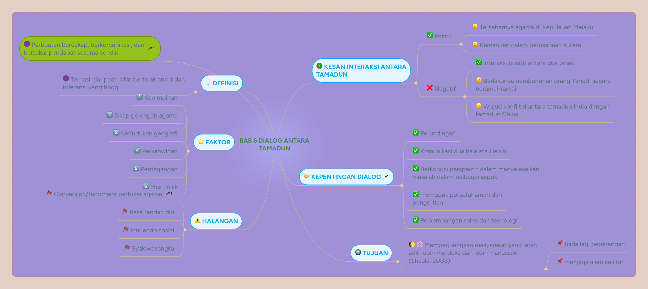 Interaksi antara tamadun melayu dan tamadun islam. Tamadun islam tegak dicetus atas dialog yang membina dan prinsip memberi dan mengambil. Dengan itu ia dapat menghadamkan pencapaian sains yang mekar. Interaksi antara pelbagai tamadun dan kesannya kepada perkembangan tamadun manusia. Kuliah 5 model dalam aktiviti evaluasi.