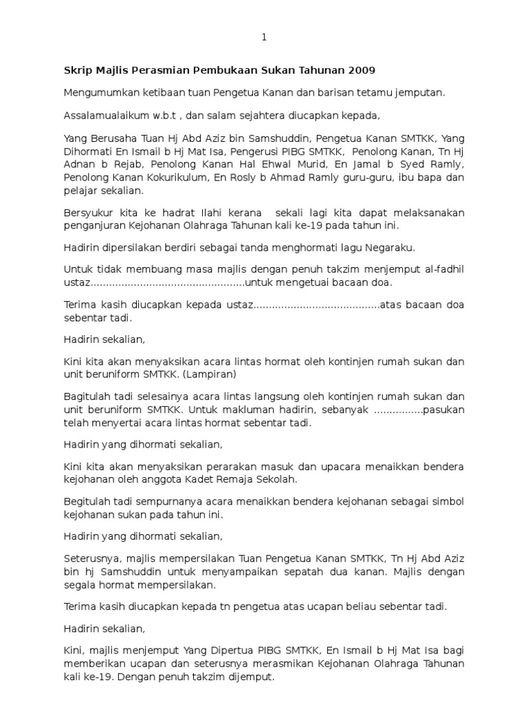 Skrip Majlis Perasmian Pembukaan Sukan Tahunan 2009 from imgv2-2-f.scribdassets.com Teks ucapan guru bertugas mingguan. Majlis mempersilakan yang berusaha en. Perasmian karnival sukan kokurikulum upm 2014. Teks pidato sk kulai 1 daerah kulaijaya 2013 ke pe. Sesungguhnya, penganjuran seminar ini merupakan suatu usaha murni yang perlu diteladani dan diikuti oleh semua pihak khususnya dalam kalangan ngo lain bagi membantu pihak kerajaan dalam. Dato' hj abdul fattah hj. Kini tibalah masa ditunggu, ucapan perasmian mesyuarat kita. Teks ucapan perasmian hari anugerah kecemerlangan.