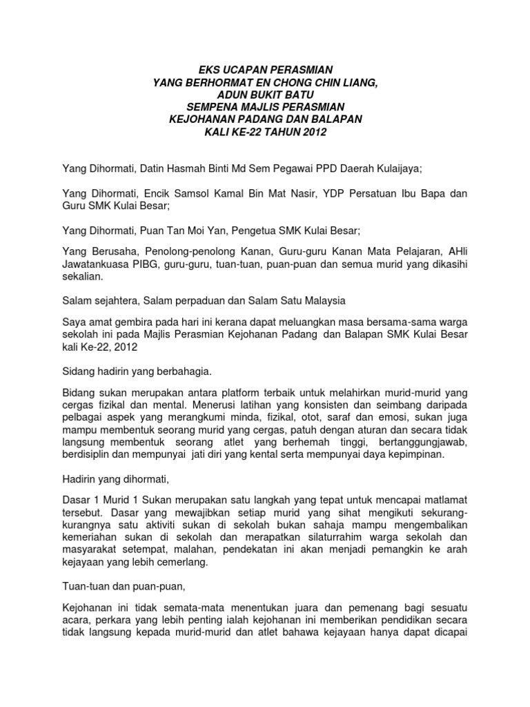 Teks Ucapan Perasmian Sukan / 1 : Teks ucapan perasmian majlis bersama pertubuhan bukan kerajaan.. Ucapan perasmian majlis hari anugerah & graduasi 2019 #skptldm1подробнее. Ucapan perasmian dan gimik perasmian oleh yang berbahagia datuk ong kim swee, jurulatih pasukan 10. Teks ucapan perasmian yb datuk hjh azizah datuk seri panglima hj mohd dun timbalan menteri pembangunan wanita, keluarga & masyarakat. Ucapan sambutan 1malaysia teks ucapan 1 malaysia. Majlis perasmian wisma levida.my dan menyaksikan.